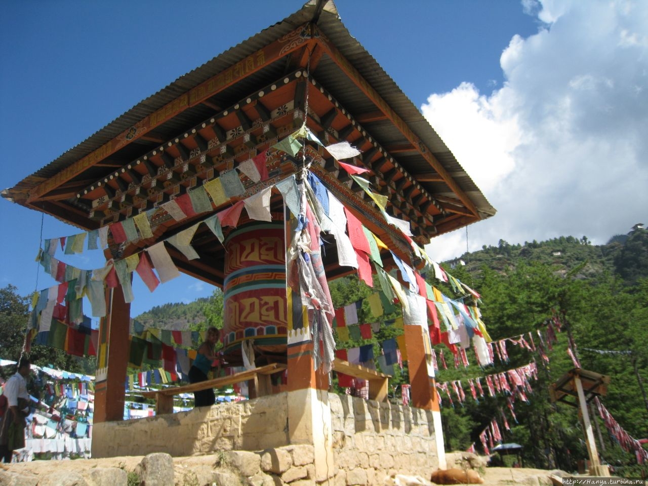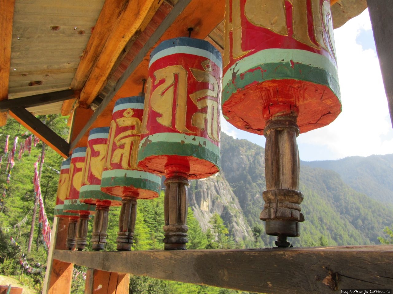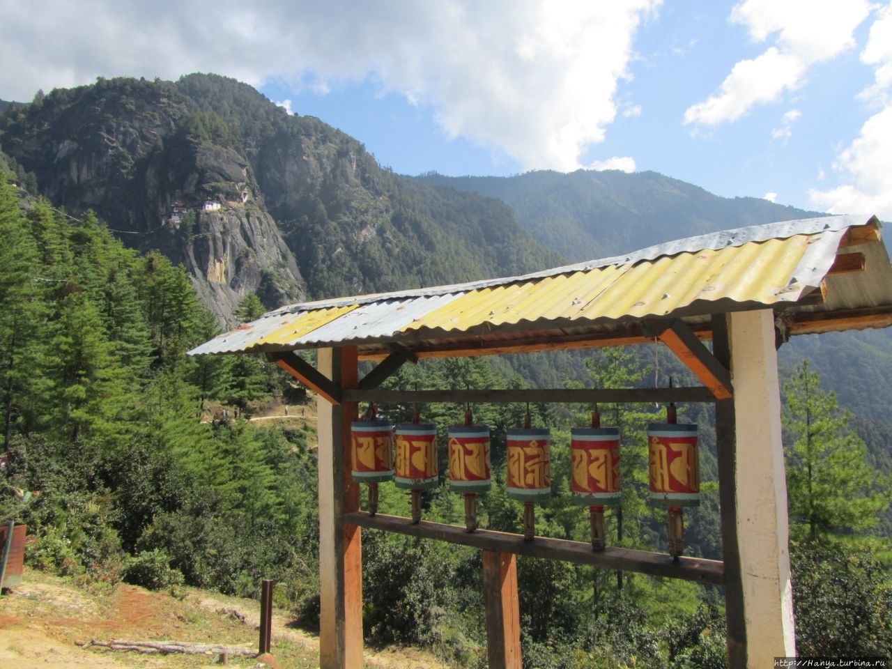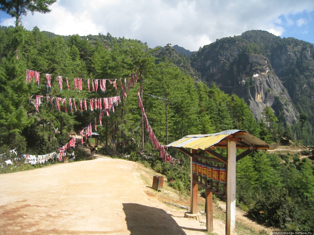 Enjoy your hiking! Или как пройти полпути к Тигриному гнезду), мы выходим на открытую площадку, где под крытым козырьком установлены 6 молельных барабанов. Отсюда открывается часть дороги, по которой нам предстоит пройти и вертикальная скала с прилепившимся на ней монастырем Taktshang Goemba (Гнездо Тигрицы). Вид при свете дня просто потрясающий, но совершенно непонятно, как можно подобраться к этому «ласточкиному гнезду» на скале. Идем дальше, туда, где все крутят большой молельный барабан.
