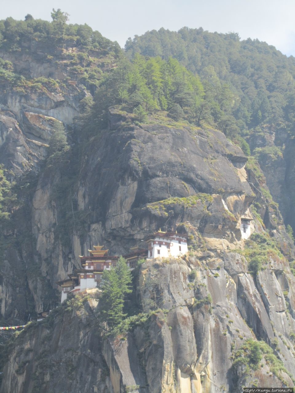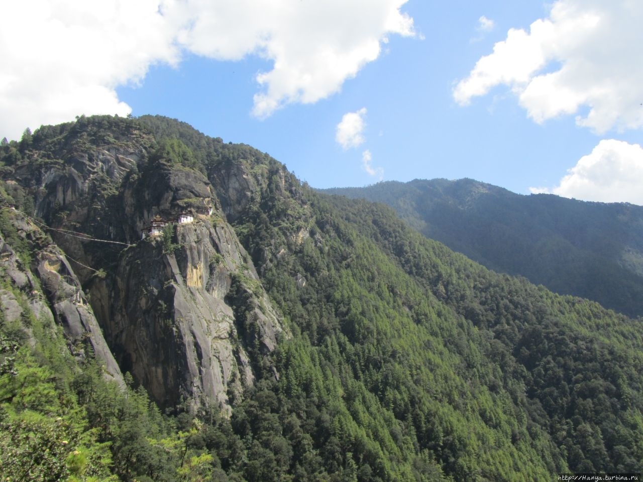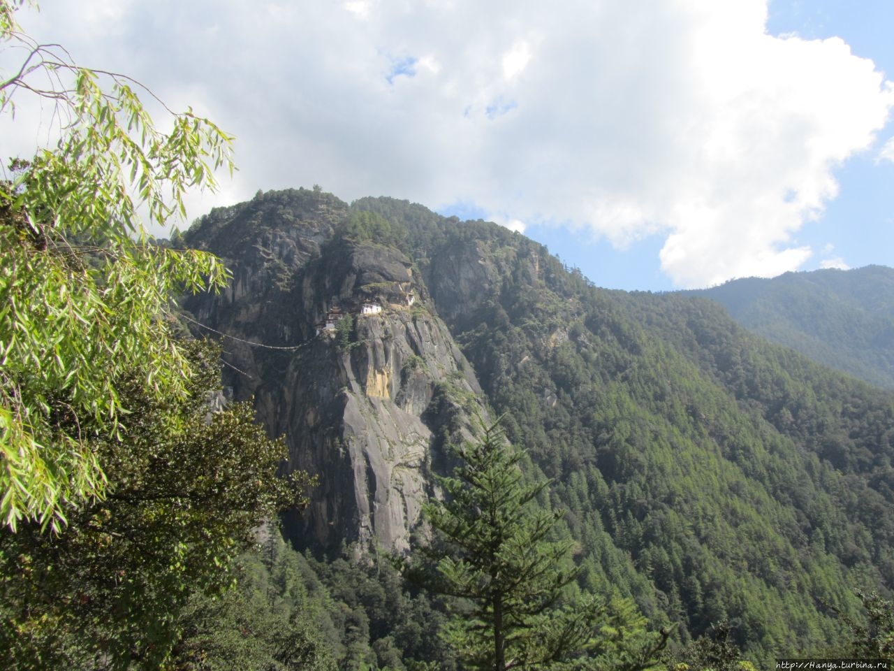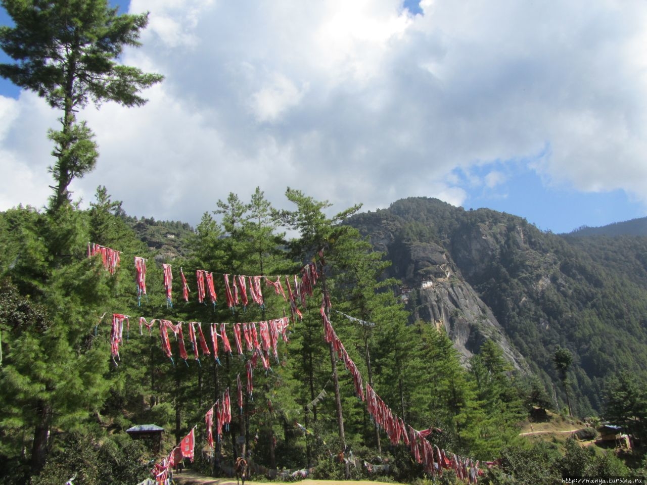 Enjoy your hiking! Или как пройти полпути к Тигриному гнезду), мы выходим на открытую площадку, где под крытым козырьком установлены 6 молельных барабанов. Отсюда открывается часть дороги, по которой нам предстоит пройти и вертикальная скала с прилепившимся на ней монастырем Taktshang Goemba (Гнездо Тигрицы). Вид при свете дня просто потрясающий, но совершенно непонятно, как можно подобраться к этому «ласточкиному гнезду» на скале. Идем дальше, туда, где все крутят большой молельный барабан.