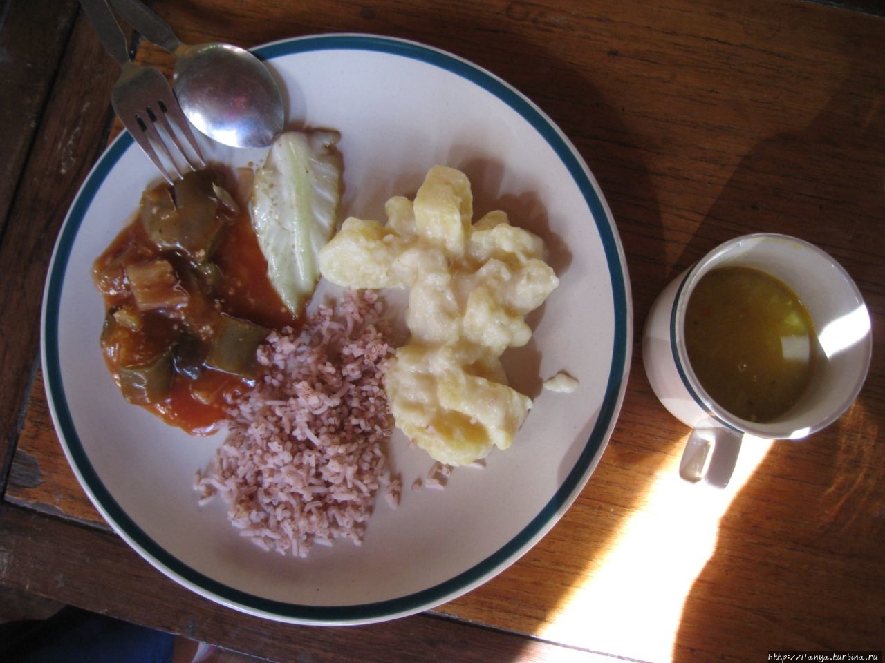 Еда была простой и незамысловатой, но показалась нам вкусной – грибной суп, картошка, розовый рис, баклажаны. Мяса здесь не было, в основном вегетарианские блюда.