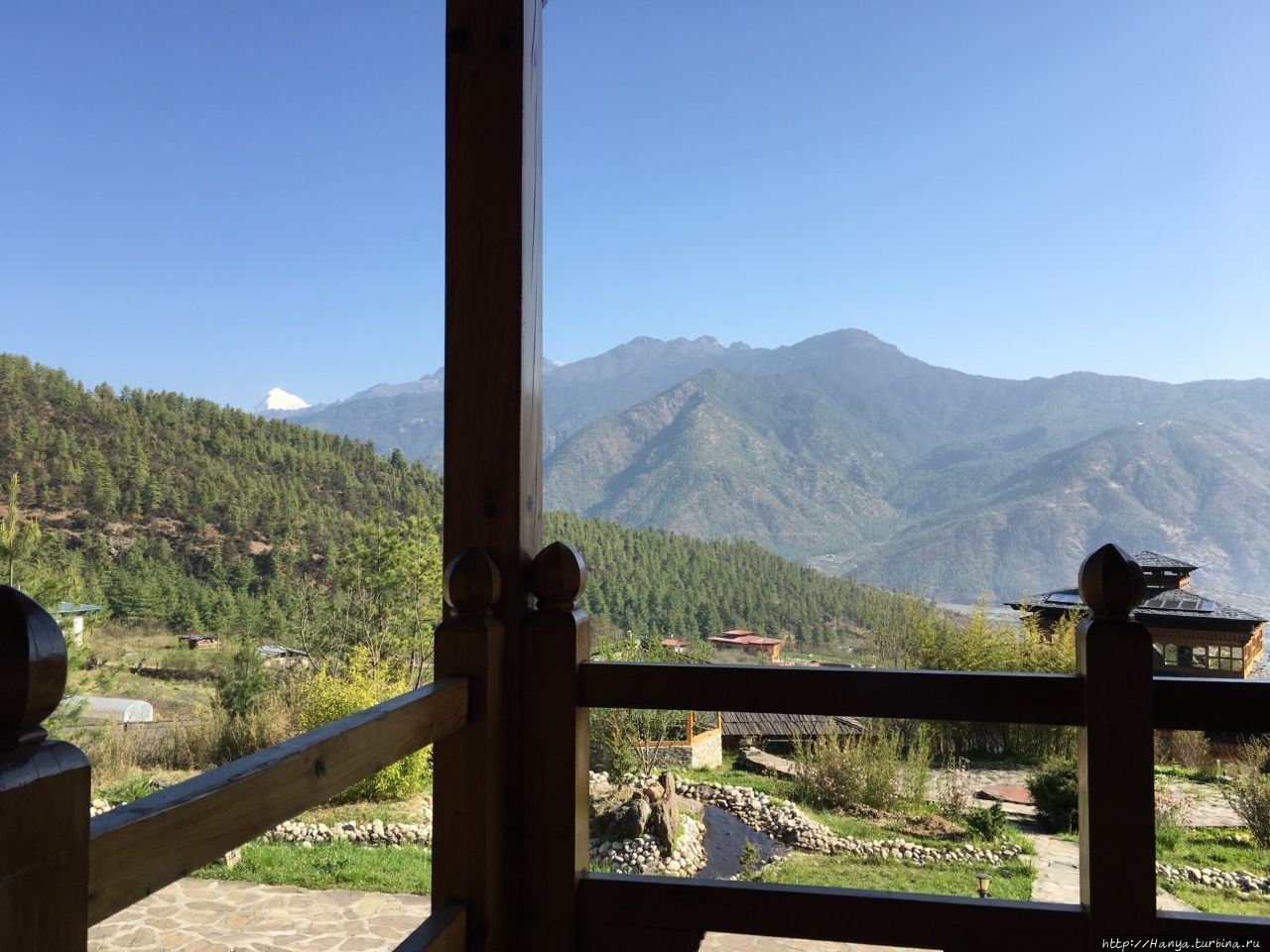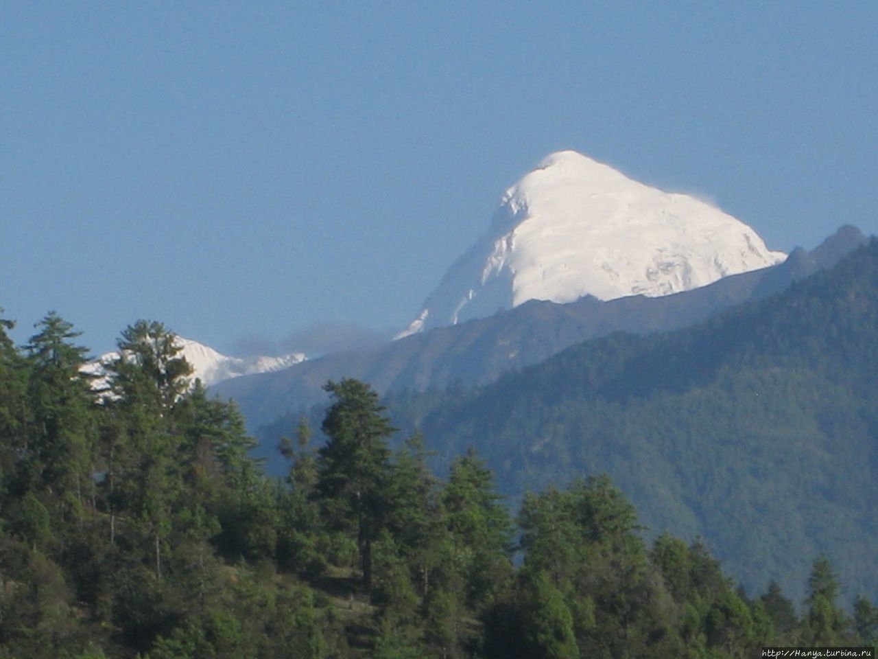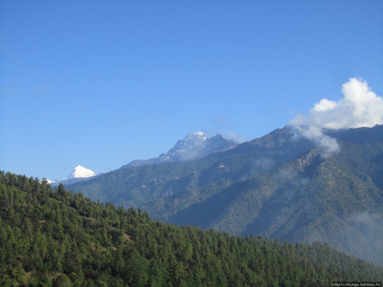 «Ужасный» город Хаа и его счастливые жители. Ч.86). Утро последнего дня подарило ясный день и великолепнейшие виды на горный массив Гималайского хребта. Уж не знаю, был ли это семитысячник Джомолхари, или нет, но видимость была отличная, горы казались такими близкими, а ведь они находятся на границе Бутана и Тибета.