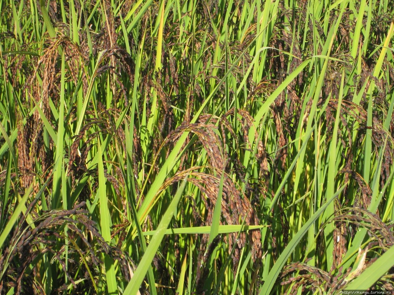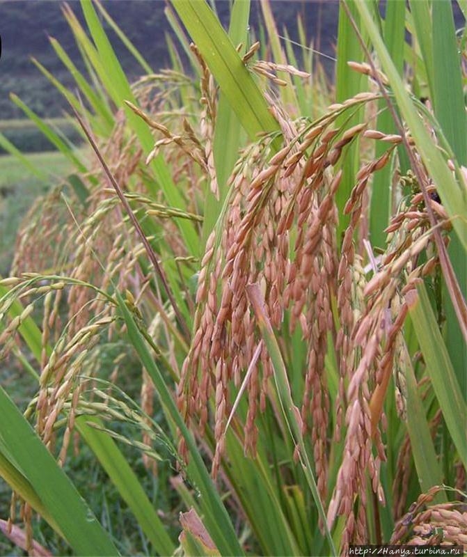 Кидаем последний взгляд на разрисованные дома и просим сделать остановку у рисового поля. Рисовые метелочки здесь черного цвета, и среди зеленых листьев – это очень неожиданно.