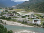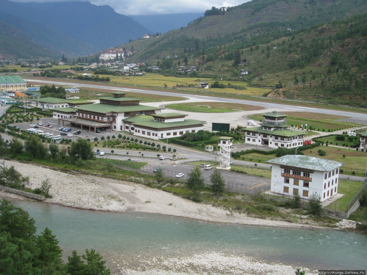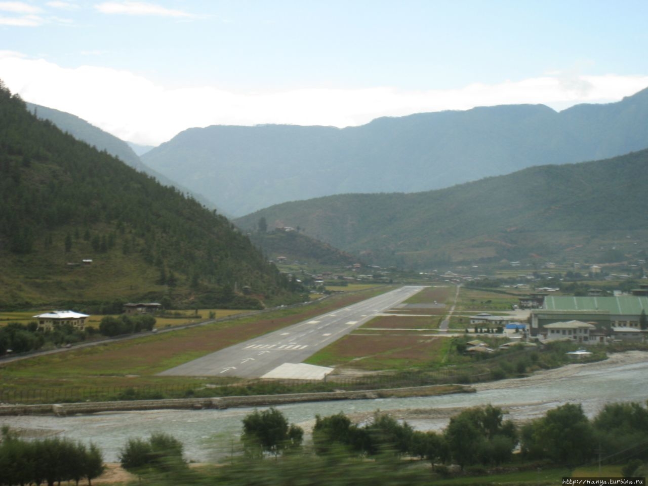 Ближе к Паро меняется природа, горы становятся ниже, сквозь редкие деревья просвечивают каменные породы. Видим коров, пасущихся на крутых склонах гор. Как они туда забираются одному богу известно. Развилка Чусом, частный храм Tamchhog Lhakhang, и мы уже над аэропортом в Паро, где еще недавно приземлились в этой стране. Уже хорошо видна взлетно-посадочная полоса и квадраты заплат засеянных полей.