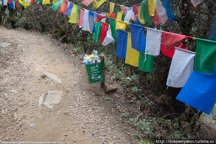 Вдоль всей тропы развешаны буддистские флажки, а иногда встречаются урны с предупреждениями об использовании презервативов.