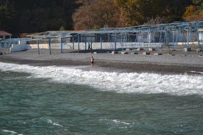 с другой стороны в мыс Кале-Поти. Даже в ноябре на пляже есть одинокие купальщики. В это время года командиры на пляже -птицы. От пляжа уходит в море пирс, с которого хорошо любоваться видами побережья, в том числе горой Аю-Даг и скалой Кучук Аю. А так выглядит с пирса посёлок Партенит.Хоть и не пришлось искупаться в море, но прогулка получилась приятной.