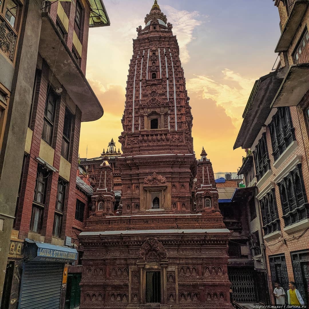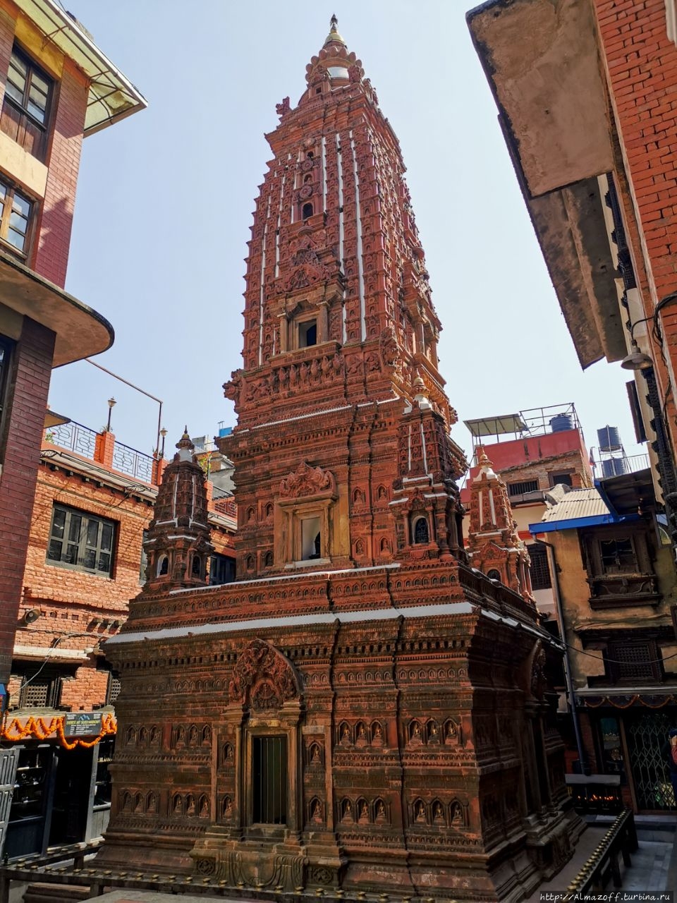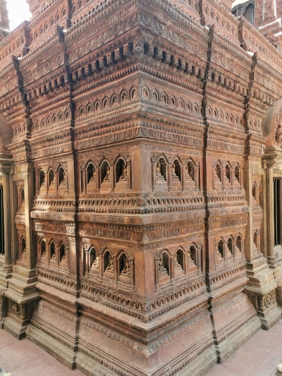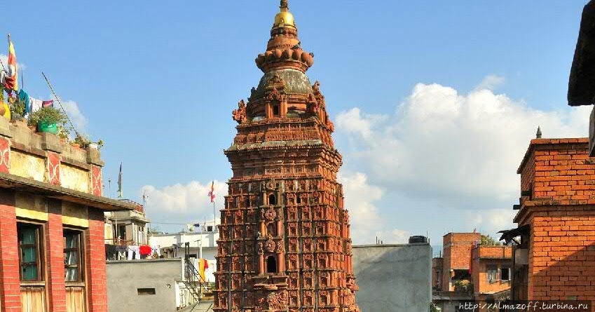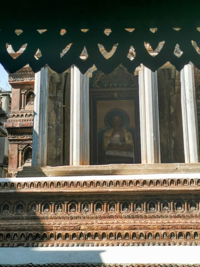 К сожалению, поскольку терракотовая святыня находится в небольшом внутреннем дворе, где не хватает свободного пространства, чтобы увидеть верхушку ступы. Для этого нужно подняться на крышу соседних домов.