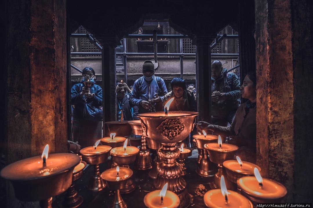 А ещё из окна храма можно заглянуть в лицо Будде Безграничного Света (тиб. Опаме, санск. Амитаба), статуя которого установлена на втором уровне ступы. Снизу, от подножия ступы его не видно.