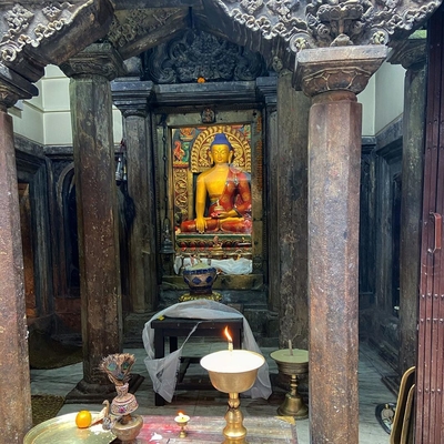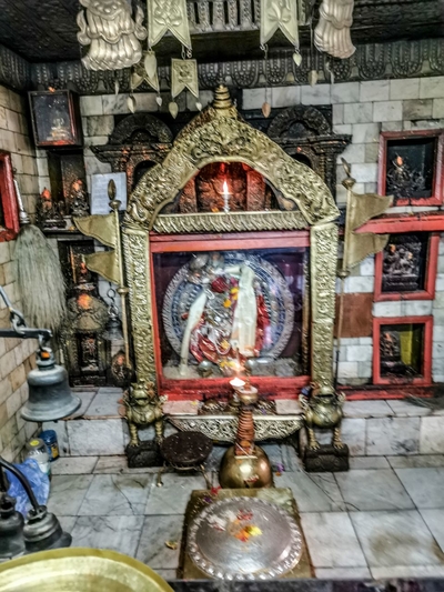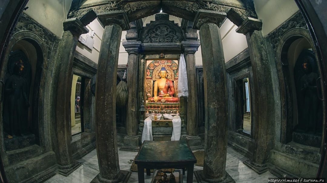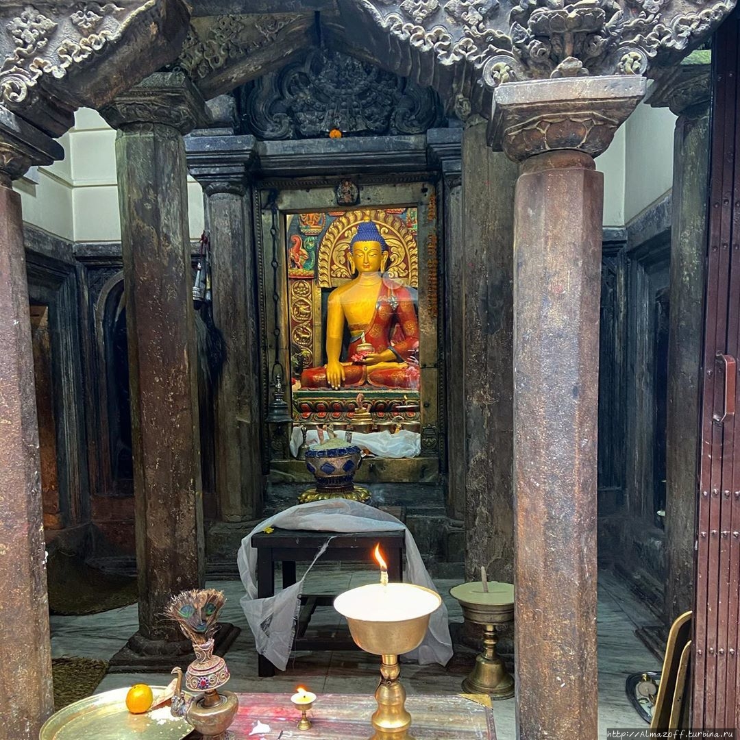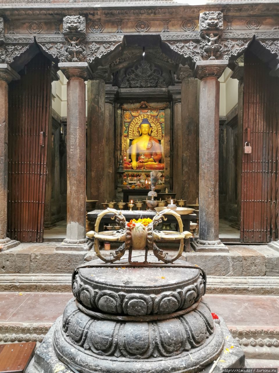 В храм Ваджрайогини не так уж и легко попасть, особенно если ты не знаешь где в него вход. У входа сидит смотритель-охранник, который пустит вас внутрь только удостоверившись, что вы не просто турист, а практик Дхармы. Храм находится на втором этаже слева от входа во внутренний двор со ступой Махабудда. Низкие потолки и немного закопчённый потолок. В отдельной комнатке статуя Ваджрайогини на алтаре. Можно попросить смотрителя приложить ваши чётки к лотосу, на котором стоит статуя. Насколько древняя эта статуя в найденных мной источниках не говорится, ну да и не так уж это и важно в конце концов.