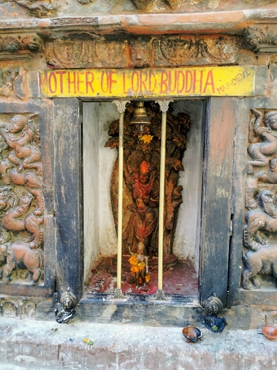 Еще одна маленькая терракотовая ступа установлена в этом дворе — ступа Махамайи, матери принца Гаутамы (будущего Будды), также очень почитаемая местными и не только буддистами. В ступе установлена скульптура матери Будды, маленького принца Гаутамы и следы его первых семи шагов.