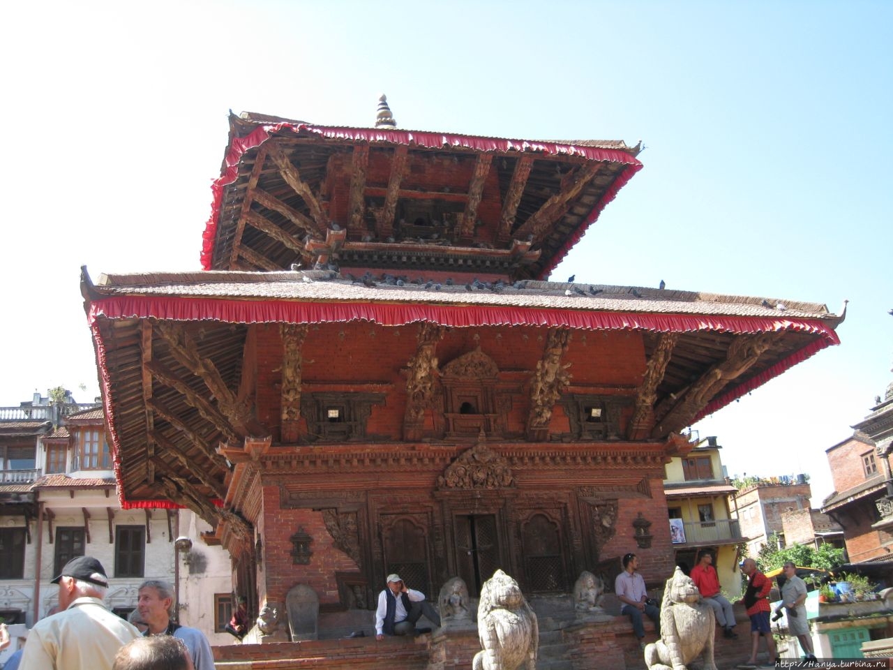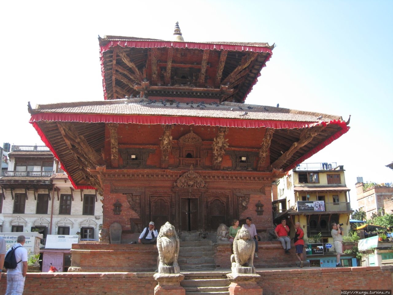 Храмы Нарсимха и Вишну, колонна с королем и Вишну на купюрах) со стоящей напротив него колонной короля, мы любуемся храмом Char Narayan, находящимся немного в глубине. Этот храм также известен по нескольким именам, и его другое название Jagannarayan (или еще в таких транскрипциях — Jagan Narayana, Jagat Narayan temple). Возможно, это самый древний храм на этой Дворцовой площади Дурбар в Патане.В отличие от других храмов на площади, он построен в основном из кирпича. Некоторые ученые считают, что он был построен в 1565 году, в то время как другие предполагают, что это было в начале 17-го века, считая эту дату более разумной. Чтобы достичь консенсуса ученые согласились, что храм претерпел «только незначительные изменения» с момента его строительства.