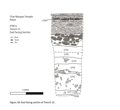 этим воспользовались ученые, которым стихия предоставила возможность раскопать траншею с востока на запад через существующую мощеную кирпичом площадь. Всего на площади было прорыто три траншеи, которые позволили исследовать основание рухнувшего Джаган Нараяна, а также последовательности развития самой площади Дурбар в Патане.