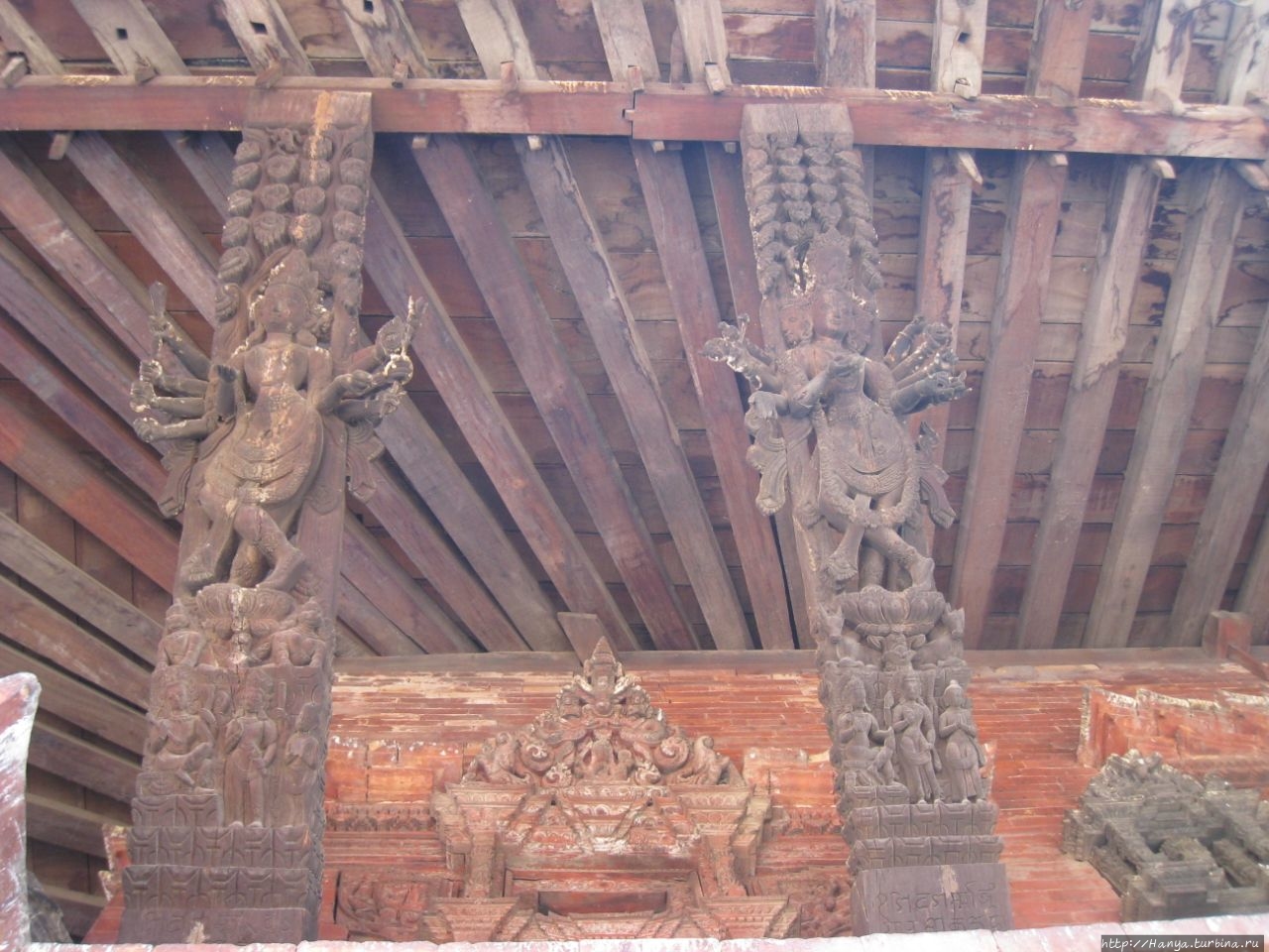 В качестве действующих лиц и исполнителей на распорках, поддерживающих крышу, вырезаны различные Боги, Богини и божества, демонстрирующие разнообразные и замысловатые позиции из индийской Кама-сутры.