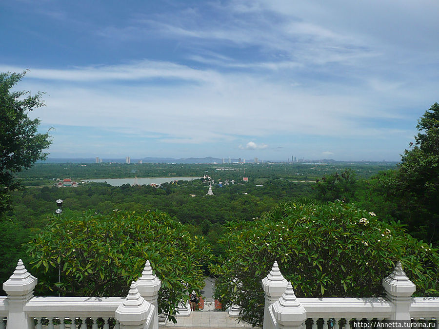Далее мы посетили ступу с прахом Будды. И завершающий аккорд нашей экскурсии — пагода на горе, а в ней отпечатки стоп Будды. Но для того чтобы их увидеть, необходимо преодолеть множество ступеней довольно крутой лестницы. Среди нас была женщина-пенсионерка. Она хотела было отказаться от покорения этой вершины, но мы её уговорили. Снизу нас подбадривал наш водитель -таец. И мы дошли. Но к моему огромному сожалению пагода была закрыта и отпечатка стоп Будды мы не увидели. Зато нашему взору открылись прекрасные панорамные виды. Какое-то время мы сидели и любовались окрестностями. Потом обошли пагоду вокруг, постучали в колокола, загадывая желания, и спустились вниз, где нас поджидал наш водитель. Хочу заметить, что во всех помещениях храмового комплекса строгий дресс-код — плечи и колени должны быть прикрыты. Если нет, будьте добры одеть юбки-рубашки, которые вам предложат.