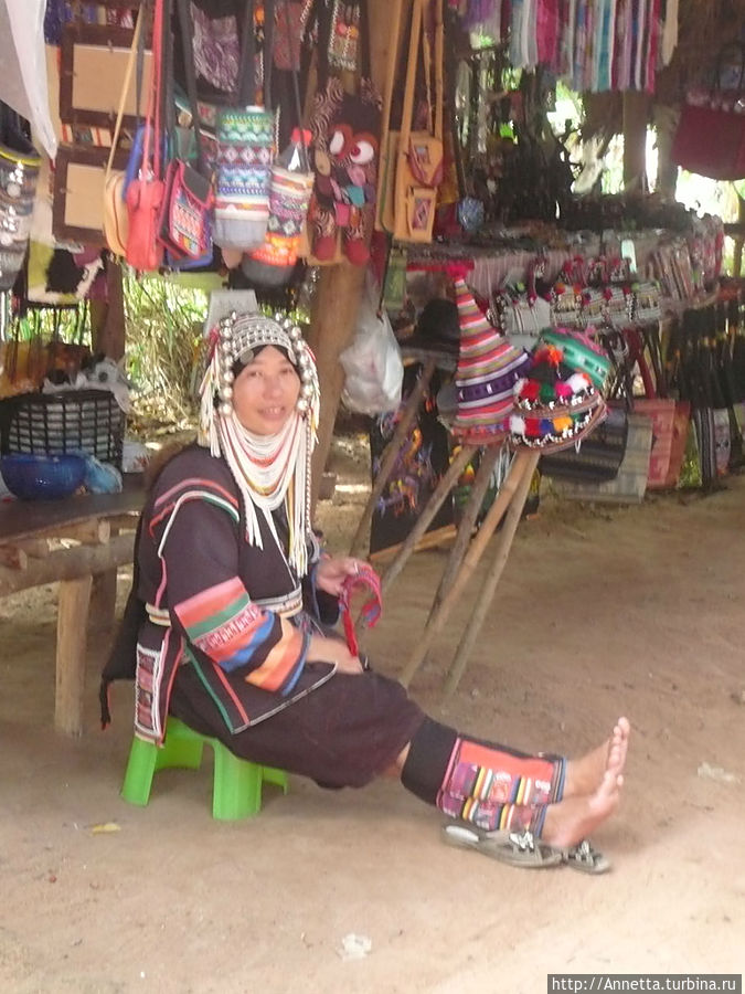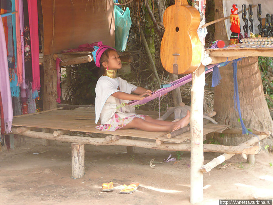 Следующий пункт — деревня каренов. Конечно же, это не настоящая деревня, а сделанная для туристов, стилизованная под возможно некогда существующий быт этого племени, но все равно интересно посмотреть на длинношеих женщин, ткущих изделия на ручных станках. Тут же эти изделия можно и купить.