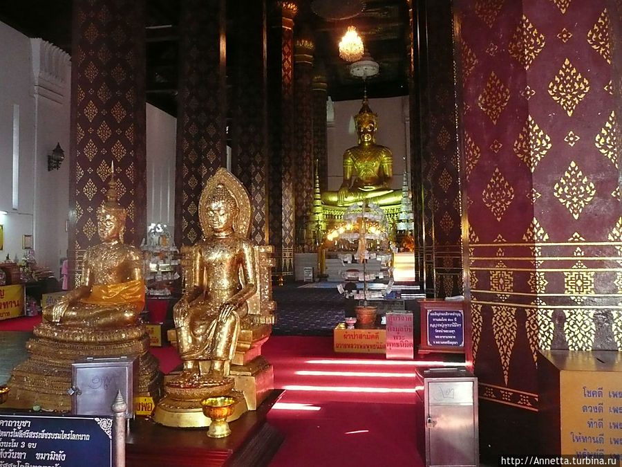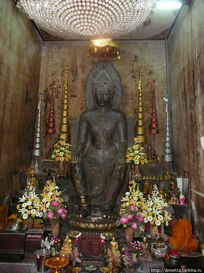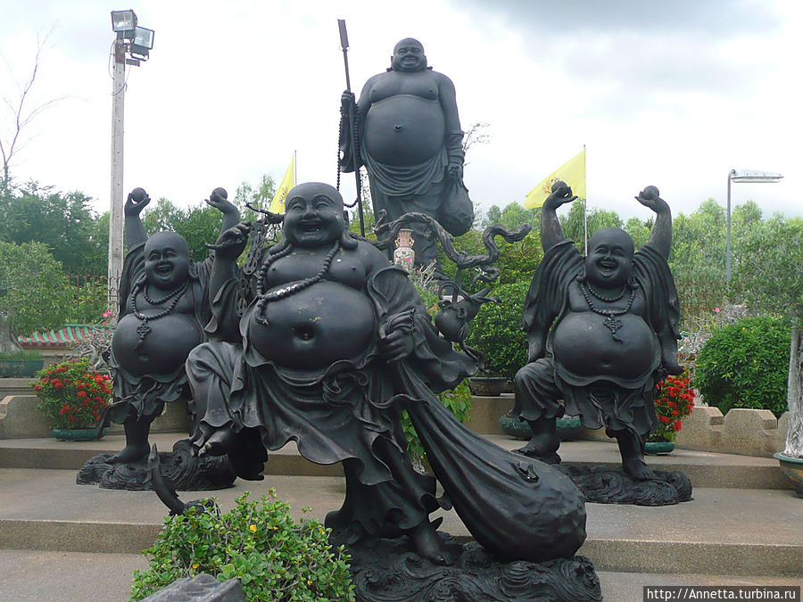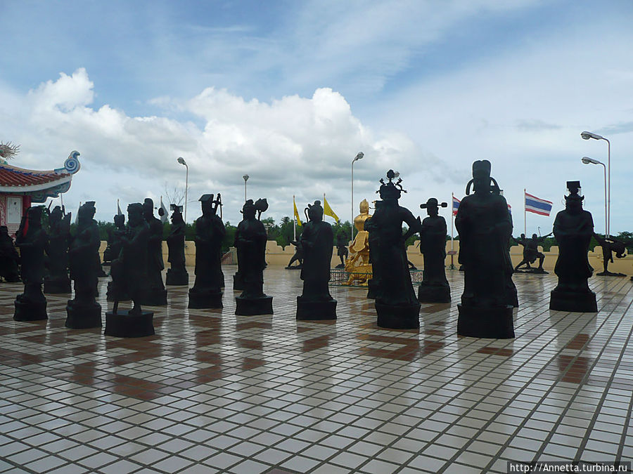 Ну, и основная цель нашей поездки — храмовый комплекс Ват Ян. Он включает несколько храмов, построенных в разные года. Вокруг — сады, пруды с рыбками, для которых тут же продается корм. Все очень красиво. Мы посетили китайский храм с уникальной коллекцией экспонатов . Это фигуры из бронзы – персонажи китайского эпоса, фигуры монахов, выполненные из воска, изображающие боевые приемы, фигуры воинов храма из монастыря Шао Линь. Все они стоят на площадке под открытым небом — этакое черное войско. В одном из залов представлен макет знаменитой терракотовой армии, а так же несколько настоящих терракотовых воинов этой армии. Так же есть макет Великой китайской стены. Еще есть зал со множеством изображений Будды. Третий этаж посвящен жизни Будды. Там на стенах висят картины с изображениями всего его жизненного пути. И вообще там много-много всего: экспозиция масок королевского театра, куклы, изображающие героев тайского эпоса, различные предметы старинного обихода, тайские музыкальные инструменты, картины с изображением любимого тайцами короля, коллекция королевских барж, индийские уголки с индийскими божествами, мебель из королевского дворца, резные изделия из тикового дерева, даже тибетские произведения искусства и т. д. и т. п.
