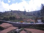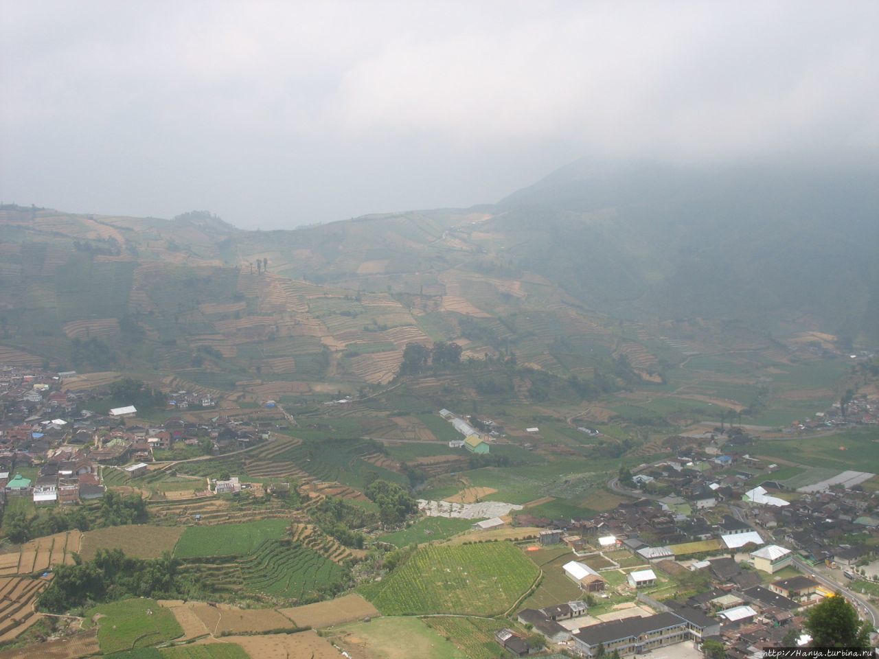 Через 2,5 часа езды гид делает остановку, чтобы на point of view мы смогли спокойно полюбоваться живописной горной цепью, у подножия которой разбросаны заплаты посадок. Сочные зеленые поля чередуются желтыми песчаными участками без посадок, рукотворные ступенчатые поля радуют глаз тугими кочанами капусты и зеленью перьев лука. Земледельческие успехи местных агрономов позволили обеспечить плато Диенг звание картофельной житницы на Яве. Смотровая площадка оборудована высокой крытой беседкой, взобравшись в которую, можно стоять и на все 360о обозревать местные красоты. Усладив глаз разнообразием красок, едем дальше, чтобы через 10 минут прибыть к храмовому комплексу плато.