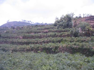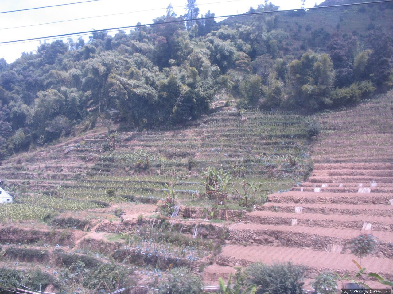 Крепкие и мощные табачные стволы иногда имеют только хохолок из широких зеленых листьев. Гид объясняет нам, что листья растения зреют неравномерно, поэтому урожай собирают снизу вверх и постепенно, начиная со средних слоев. На каждом из стеблей может произрастать до 18 листьев, сбор их всегда осуществляется только вручную! По мере идущей серпантином вверх дороги пейзаж сменяется, появляются чайные плантации, а затем еще выше, где исчезает жара, появляются грядки, сплошным ковром засаженные… капустой, картошкой, горохом, луком и зеленью. Это было так неожиданно и так сочно-зелено, что знакомую нам картину посадок хотелось снимать и снимать. Истинные труженики села здесь используют каждый клочок земли, каждую ее пядь, несмотря на крутизну склонов (боже, где же наше земледелие такого уровня? Да на ровном ландшафте??). Склоны гор разработаны на ступеньки, к которым протянулись пластиковые трубы для полива. И все это поднято на непомерную высоту и тянется вверх все выше и выше. Эти сельскохозяйственные пейзажи грядок, террас и плантаций вдоль дороги раскинулись и вдаль и вширь. А еще мы читали, что здесь кроме всего прочего еще выращивают кофе и шампиньоны, которые консервируют и направляют на экспорт.