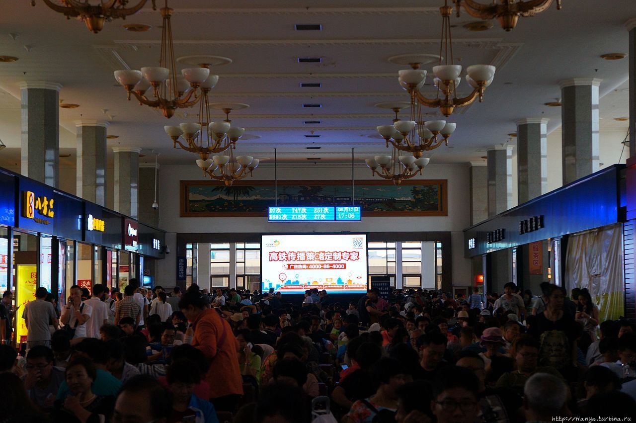 Практически сразу попадаем в открытые двери вокзала, войти в которые можно только через «просветку» багажа, как в любом аэропорту. Ставим вещи на ленту, туда же идет ручная кладь – хвала здравому смыслу, обувь и куртки снимать не надо. Снова проверяют билет, и вот мы уже в святая святых – на самом вокзале! Здесь следует объяснить, что без билета не только проехать, но и пройти на вокзал невозможно, проверка достаточно серьезная! Система безопасности, действующая в Китае на транспорте, подразумевает нахождение на территории железной дороги только «целевой аудитории» – пассажиров. Приехал-уехал, или ожидаешь своего поезда, а остальным на вокзале делать нечего — никого не пропустят.