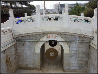 Дальше находится одна из «особенных» вещей монастыря, благодаря которой он легко выделяется среди всех остальных монастырей Пекина. Это небольшой мостик Обитель ветра (Вофэнцяо). Под ним висит огромный диск, сделанный в виде древней китайской монеты с квадратной прорезью в центре. В этой прорези висит колокол, в который можно кидать на счастье специальные круглые металлические монеты.