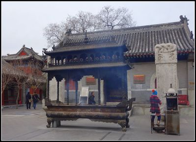 За мостиком начинаются обычные для любого китайского монастыря постройки, а именно залы божеств, перед которыми установлены курительницы для ароматных палочек и стелы с надписями.