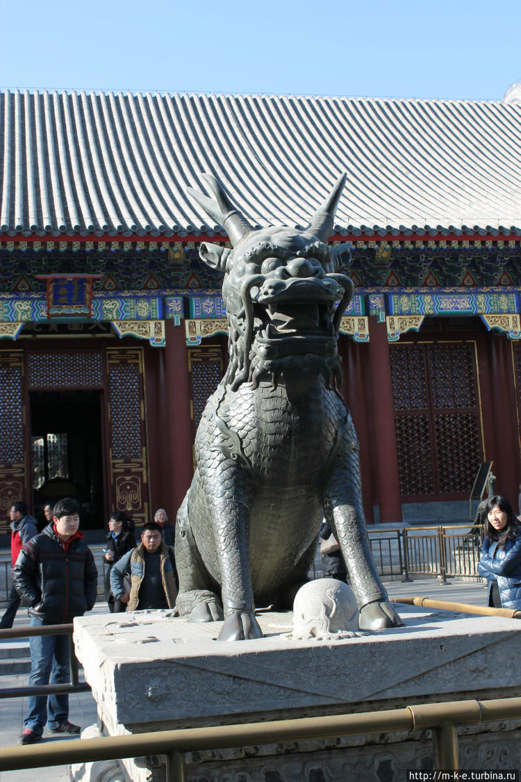 Во дворе стоит скульптура Сказочной твари Цилинь — одного из девяти сыновей дракона — легендарного животного с головой дракона, гривой льва, рогами оленя и туловищем быка, покрытого чешуей.