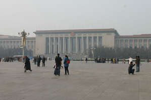 За памятником простирается огромное пустое пространство площади. Именно в этом месте ощущаешь ее громадное пространство. Можно кроме этого поглазеть направо и налево. Здания практически идентичные. Левое по ходу нашего движения — место заседания народных представителей. Здание носит название Дом Всекитайского собрания народных представителей.