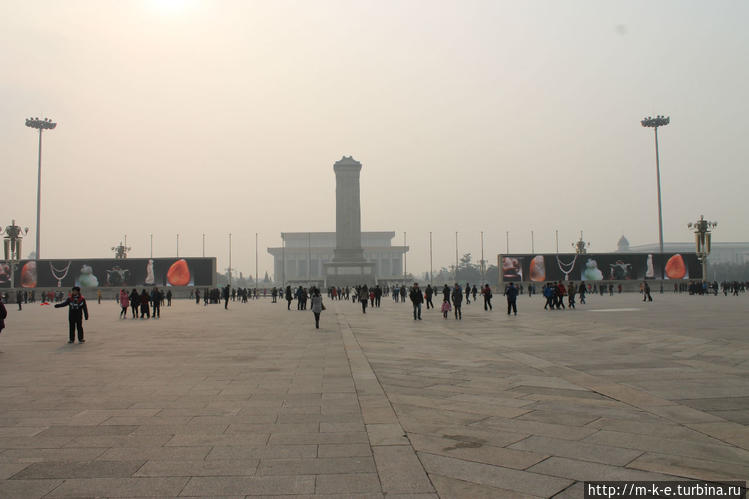 Первое , что увидели мы, попав на площадь это скульптурная группа, практически рабочий и колхозница, осталось только добавить в руки серп и молот, да и глаза чуть расширить. На самом деле это фигуры изображающие группы строителей коммунизма и их детей. За памятником грандиозное здание с 44 гранитными восьмигранными колоннами, сделанными из желтого гранита. Это мавзолей Мао Цзедуна. Очередь сюда не заканчивается и в наши дни. Проход по залу занимает не более пяти минут и понятное дело фотографировать нельзя.