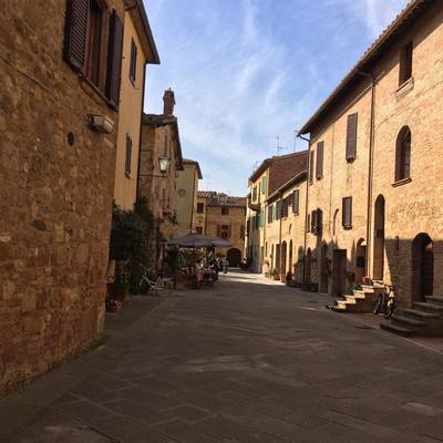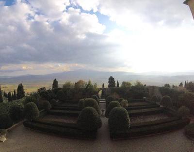 Parco Val d'Órcia, город Pienza. Панорамный вид со стороны via della Fortuna Terraza Belvedere. Античная церковь Pieve di Corsignano, построенная в 12 веке. Piazza duomo Pio 2, церковь Cattedrale Santa Maria Assunta, построенная в 1462 году.