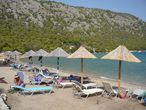 Вода в озере соленая и очень чистая. Пляж покрыт очень мелкой галькой, вдоль берега установлены лежаки и зонтики.