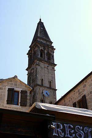 По возвращению на берег, мы попытались найти теневые места. На поиски отправились на главную площадь города. Здесь мы увидели Церковь св. Николая, колокольня которого уходит далеко в небеса.