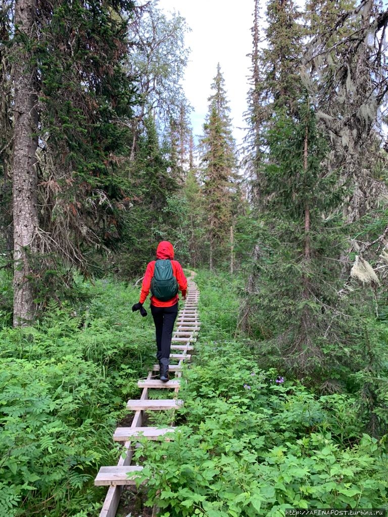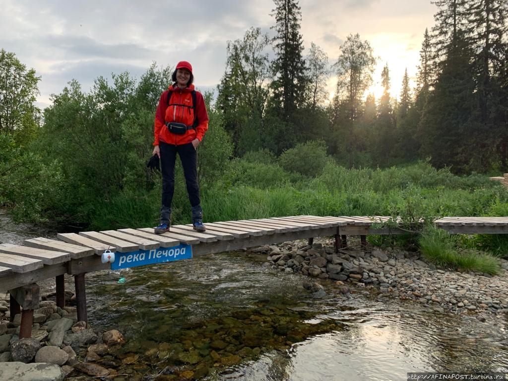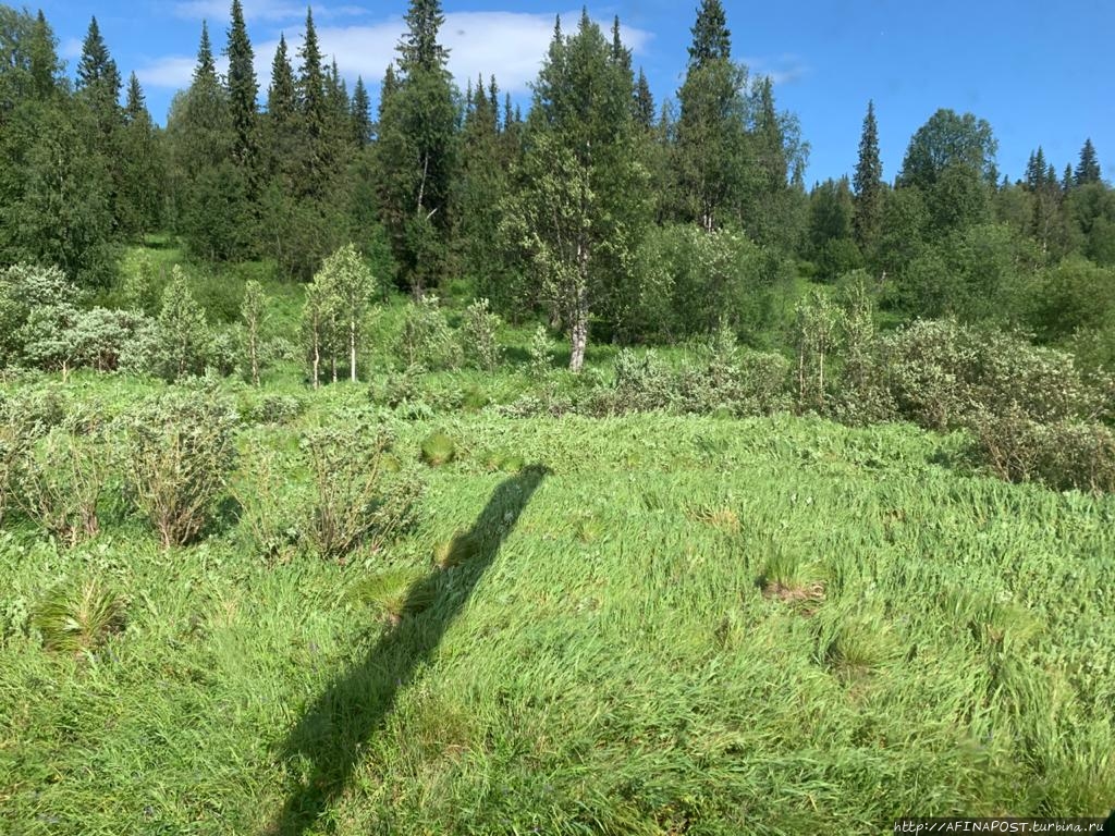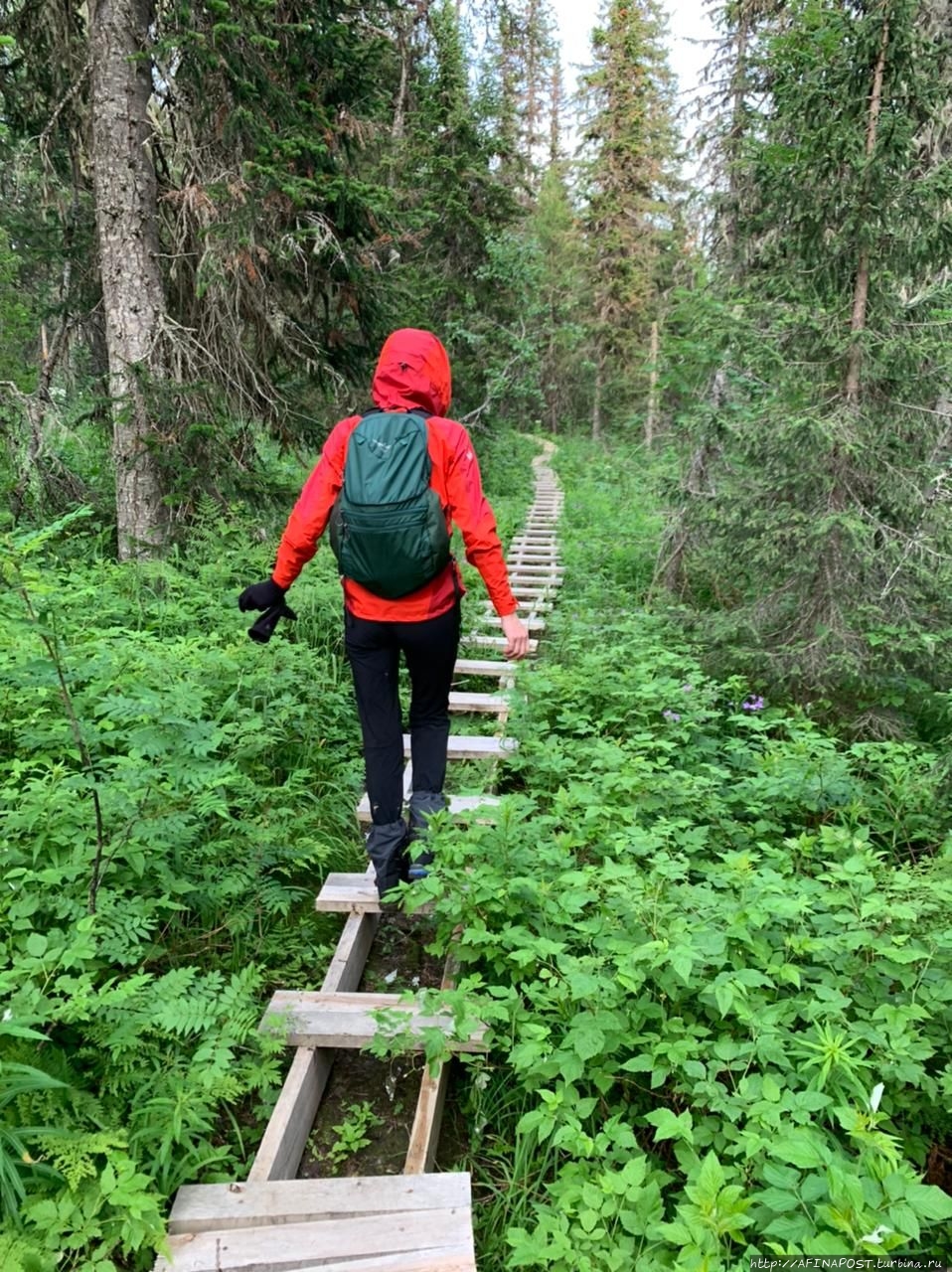 Часть нашей группы улетела. Наконец то, мы с рейнджером и минчанами пошли в тайгу к приюту, чтобы провести ночь в модулях и увидеть исток Печоры! Шли друг за другом по узкой тропе, в сопровождении назойливых оводов, комаров и мошки. На плато их было мало, потому что там дует постоянный ветер, а здесь в коридоре высоких деревьев кровожадным насекомым просто раздолье. Мы были к этому готовы — нашу одежду не прокусишь!