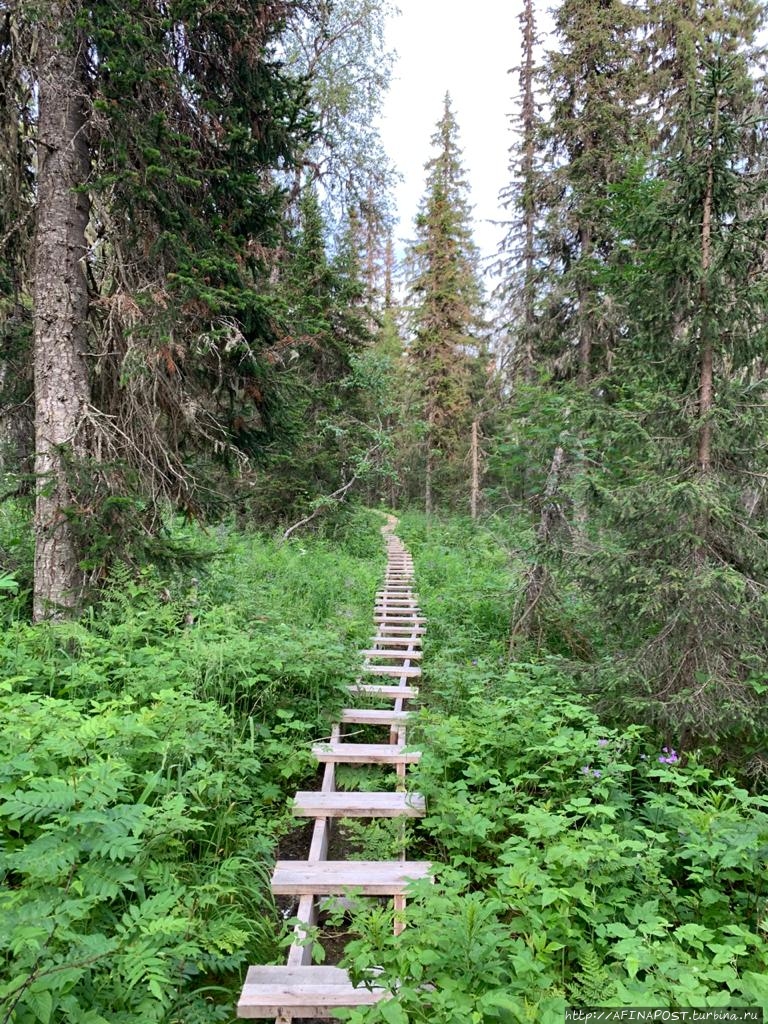 В километровой водоохранной зоне, перед истоком Печоры, тропа пошла по подвесным мостикам и нам пришлось осваивать ходьбу по дощечкам, как по клавишам.