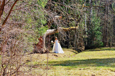 Признаюсь, с лесным духом и покровителем птиц и зверей нам в тот день познакомиться не удалось, однако мы повстречали русалку. Нашли мы её в глубине парка, мирно стоящей у дерева, в подвенечном платье и с букетиком белых цветов.