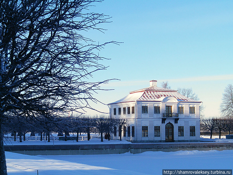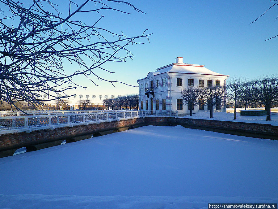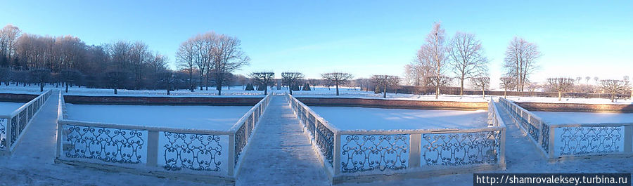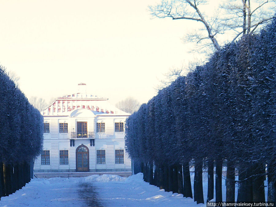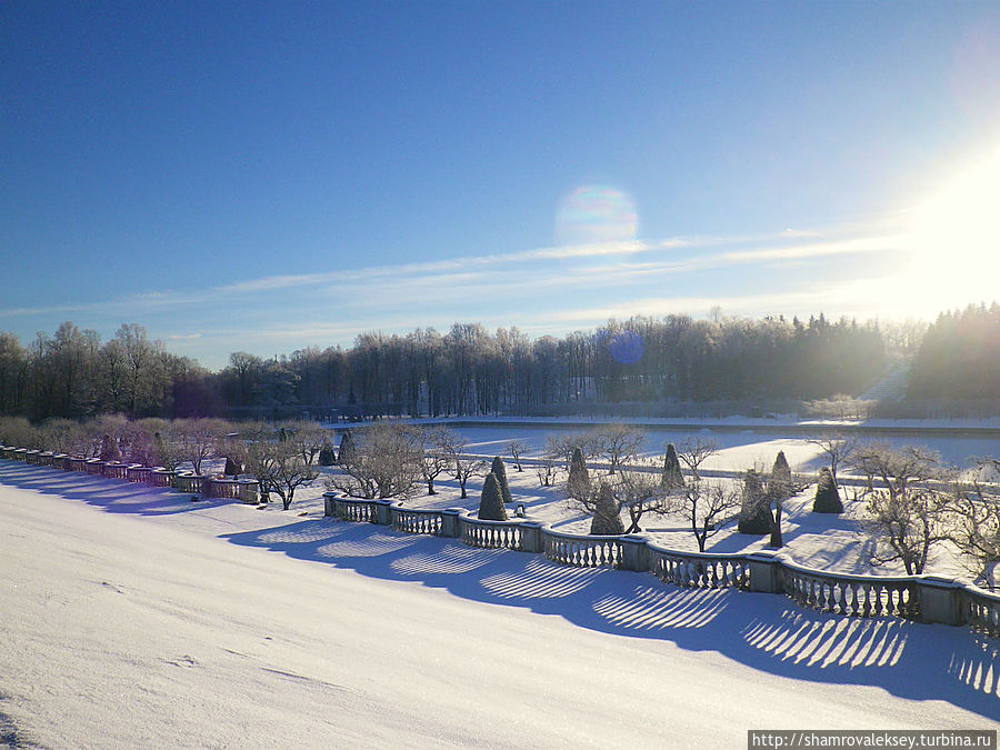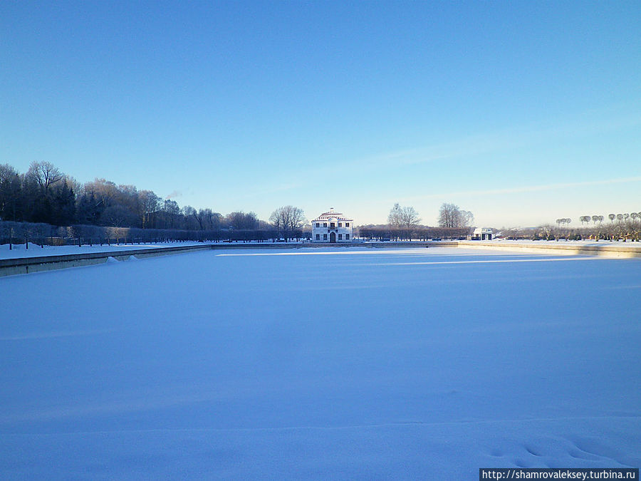 Эрмитаж.Вдали виднеется цель моей недолгой прогулки. Небольшой дворец отражается в водах большого пруда... Написал и усмехнулся, ведь на улице мороз и пруд скован льдом...