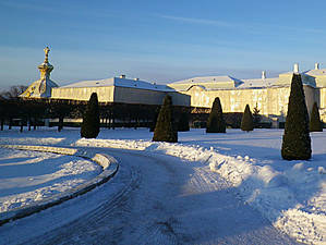 Был полдень субботы. Несмотря на все обещания метеорологов мороз не отпускал. Маршрутка неспешно повезла меня к центральному входу в Верхний сад Петергофа украшенный с двух сторон элегантными пилонами.