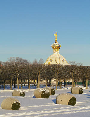 Нептун в окружении свиты и одинокий Аполлон взирающий на своего божественного родственника, да небольшие ёжики шарообразных туй, защищённые от яркого Солнца серой мешковиной.