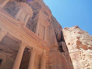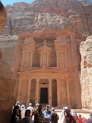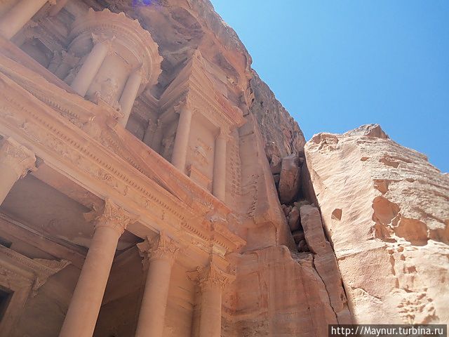 Утром на входе в ущелье присоединилась к русско- язычной группе и шла с нею до самого дворца Эль- Хазне. Гид хорошо владел русским и рассказал много интересного. Оказывается, мы шли по дороге, выложенной из камня, извлеченного из скалы , при создании дворца Эль-Хазне. Работы производились сверху вниз по мере вырубки камня. Извлечено было 80 т. кубометров , что позволило поднять уровень дороги на 1,5 метра. Высота дворца 42 метра, ширина 30 метров. Какой же мерой можно оценить мастерство древних камнетесов!