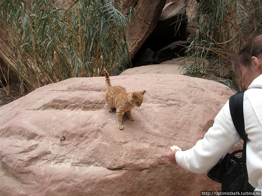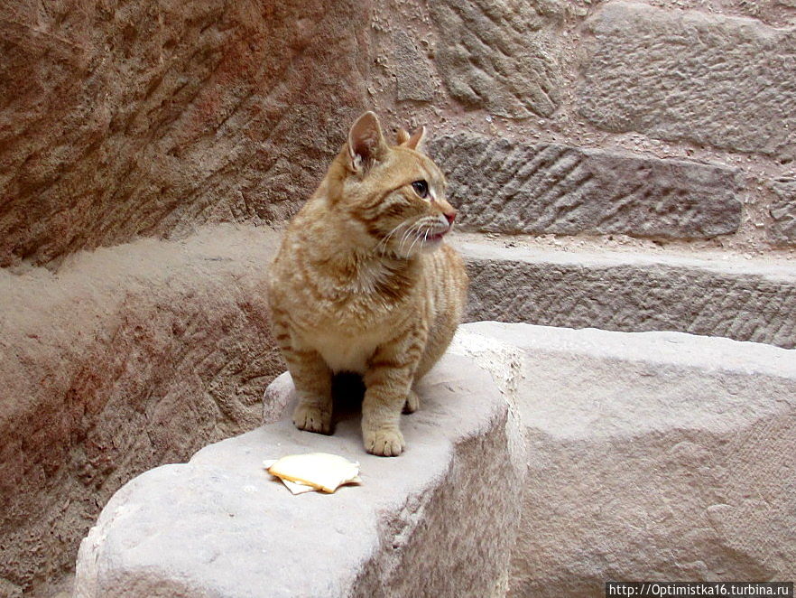 Гид обращает наше внимание на интересные детали. Вот скала, похожая на рыбу. Вот остатки скульптуры, изображающей человека и коня. А эту кошечку мы встретили на дороге. Неужели она здесь живёт? Одна и туристок дала ей немного сыра. Кошечка осталась довольна.