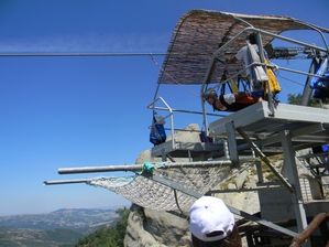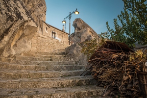 Мы пробираемся все выше по крутой каменной тропе, и угрюмые изваяния теснятся по сторонам, сжимая пространство и уже почти соединяются над нашими головами. Здесь мы находим указатель: "Полет ангела. Отправление". Это один из самых популярных аттракционов в Базиликате. В летний сезон билеты лучше бронировать заранее через интернет. Цена удовольствия 35 евро. Вам на спину прилаживают, в виде рюкзака, небольшую роликовую тележку, её закрепляют на стальном тросе, по которому вы соскальзываете в соседнюю деревню Кастелмедзано, расположившуюся в трех километрах, за ущельем. Это расстояние вы преодолеваете за полторы-две минуты, пролетая над пропастью километровой глубины. Испытания на этом не закончены. Чтобы попасть обратно, в Пьетрапертозу (вы ведь там свою машину оставили?), в Кастелмедзано, который достоин отдельного путешествия, вы поднимаетесь на станцию обратного отправления и снова, словно ангел, парите над ущельем. Разочаровавшихся пока еще не было!