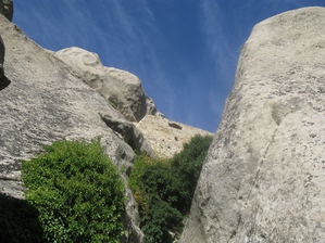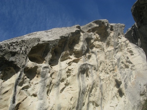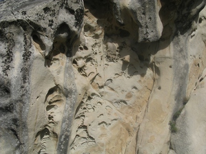 Но природа не ограничилась крупными формами. В этих скалах встречаются причудливые поверхности, покрытые, как сотами, сплошной сеткой раковин и отверстий, сливающихся в сказочные картинки. Я навожу камеру на такую "перфорированную" область и вижу в объективе жуткую рожу, оскалившуюся огромной пастью и выпучившую на меня страшные глаза. Убираю камеру – ничего! Нужно усилие воображения, чтобы поймать и сложить сочетание множественных элементов рельефа в единую картинку, вырванную случайно камерой из контекста.