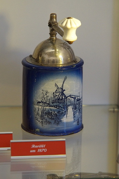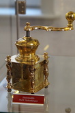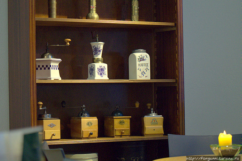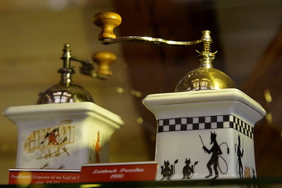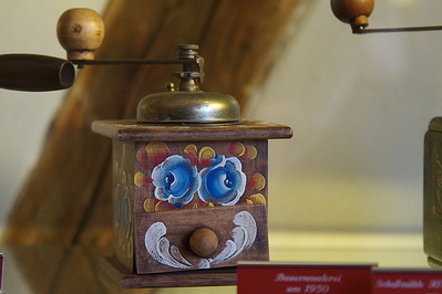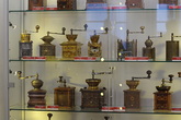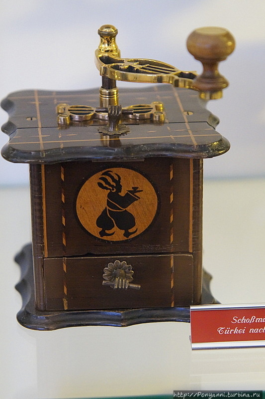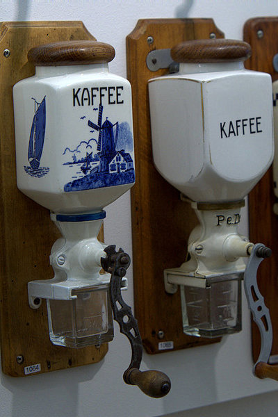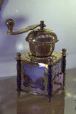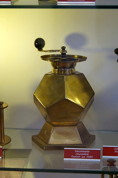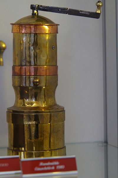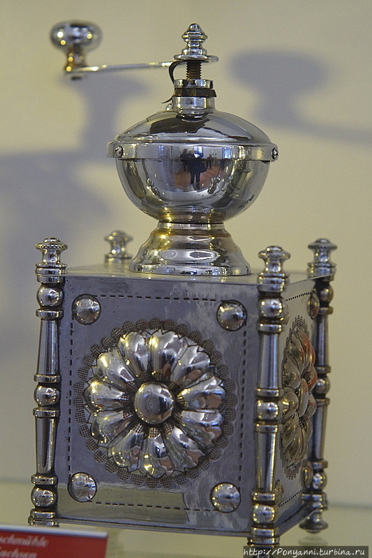 Старейшей кофемолке примерно триста лет, изготовлена она на севере Германии около 1720 года. Каких мельниц здесь только нет ! Круглые или ручные мельницы относительно небольшие, использовались с первой половины 18 века. Главное в их форме было то, чтобы их было удобно держать. Украшались различными выдами росписи, эмали и металлическими инкрустациями.