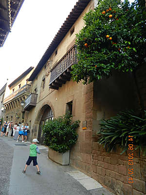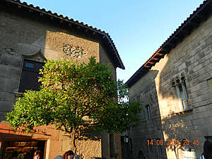 Немножко "Испанской деревни". Тематическая зона на горе Монжуик, куда подавляющее большинство туристов приезжают поглазеть на поющие и танцующие фонтаны. А скоротать время перед вечерним шоу можно прогуливаясь по типовым улочкам с магазинчиками и ремесленными мастерскими. Короче, это такой испанский средневековый городок в миниатюре, с сувенирными лавками и апельсиновыми деревьями в цвету. Кстати, последнике особенно поразили меня в Валенсии, но о ней позже.