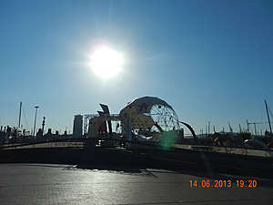 Шар мечты. Внутри — прыгалки с резвящейся детворой. Нетривиальный подход к обустройству и расположению детской игровой площадки. Она в тот момент еще была не до конца собрана, но сфера произвела впечатление сразу!