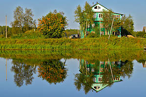 После того как дорога в Лодейном Поле свернула к Олонцу, а затем и к побережью Ладоги, стали попадаться интересные места. Мягкие утренние краски нежно окрашивали стоявшие на противоположном берегу идущего вдоль дороги канала домики, которые, в свою очередь, отбрасывали еще более мягкие тени на идеально неподвижную серо-синюю воду.