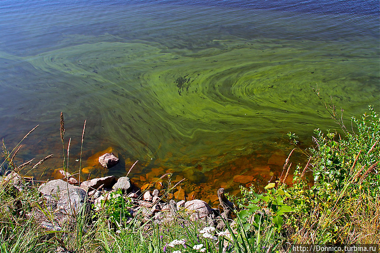 Хоть Ладожское озеро и близко от дороги, видно его далеко не всегда. Слишком уж витиеваты его берега. Но в этом месте у расписной скалы открывается очень красивый вид на Ладогу с цветущей местами водой, на ее острова и покрытые гладкими камнями берега...