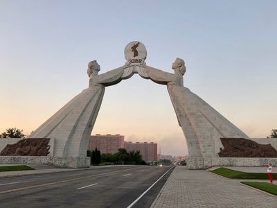 Второе — то, что северные корейцы поставили арку на большом автомобильном круге, и хотя через нее можно проехать, и некоторые проезжают, часть людей объезжает арку по внешней стороне по кругу. Так сделали и мы и непонятно до конца, произошло ли это потому, что мы были иностранцами и нас это напрямую не касается либо сами корейцы пока не решили, как и когда они готовы объединяться и суеверно не проезжают через арку по этой причине... Кто знает...