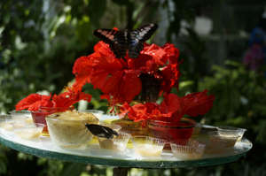 Нетрудно заметить, что бабочки сами живописны и садятся на все красочное, даже у кормушек чудесные цветы.