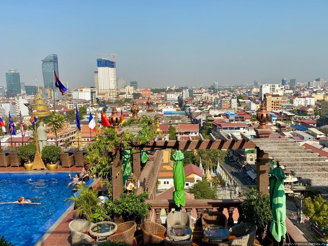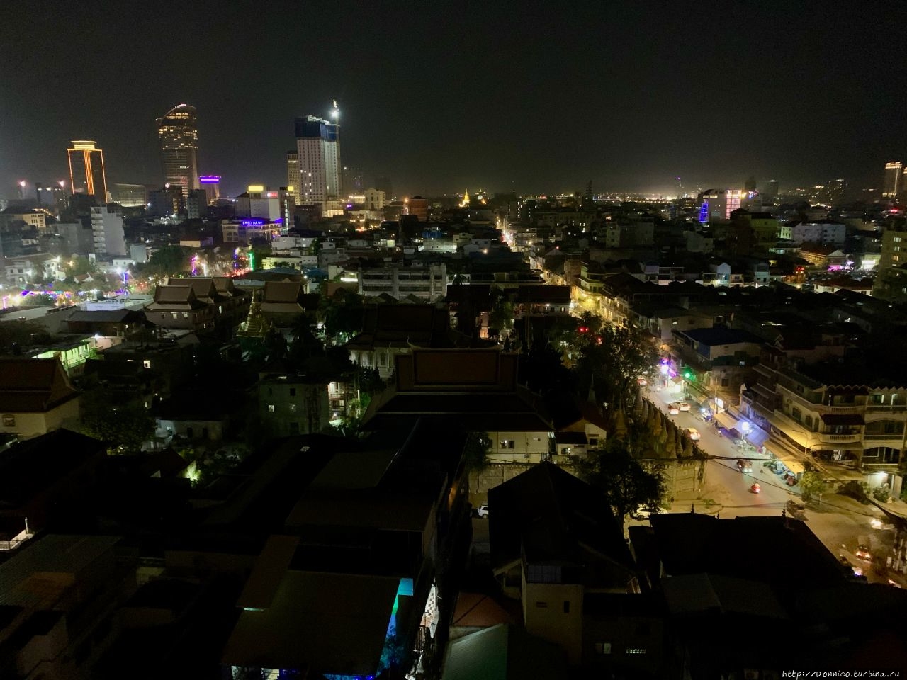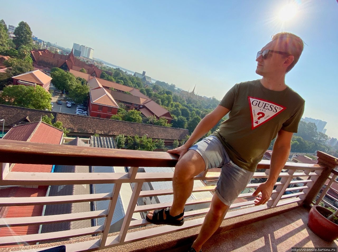 Заселившись мы поехали на лифте на крышу, на которой нас встретила довольно большая тусовка постояльцев отеля, которые отдыхали после жаркого дня около прохладного бассейна. Мы сели за столик и заказали себе ужин. Пока его делали я подошел к краю крыши чтобы посмотреть на центр Пномпеня в первый раз.