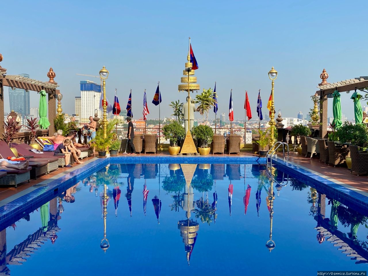 Позавтракав в столовой отеля, перед тем как выходить в город, мы заглянули еще раз на крышу и увидели как выглядит бассейн при свете дня. Совсем не так как ночью!