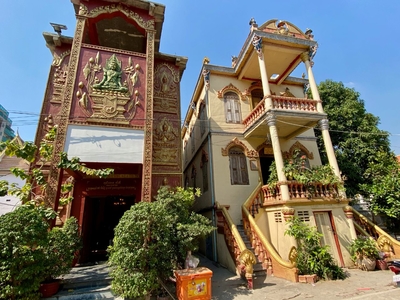 Интересно как в Пномпене все перемешивается — тут за высокими стенами и частные дома, и пагода, и скульптуры и даже автомобиль покрытый специальной попоной от жары.