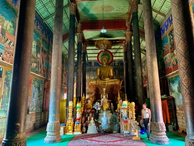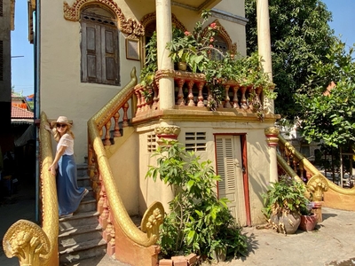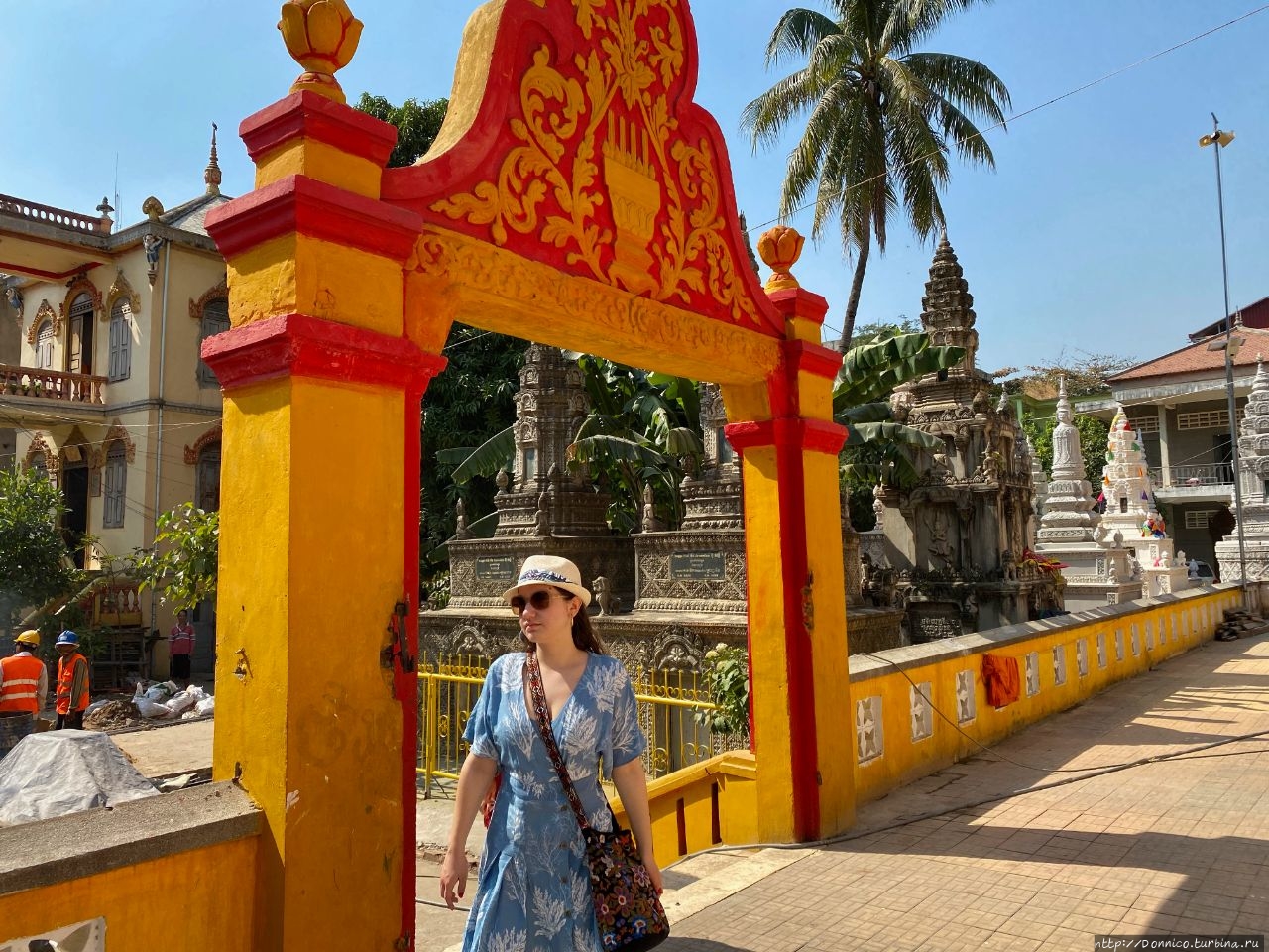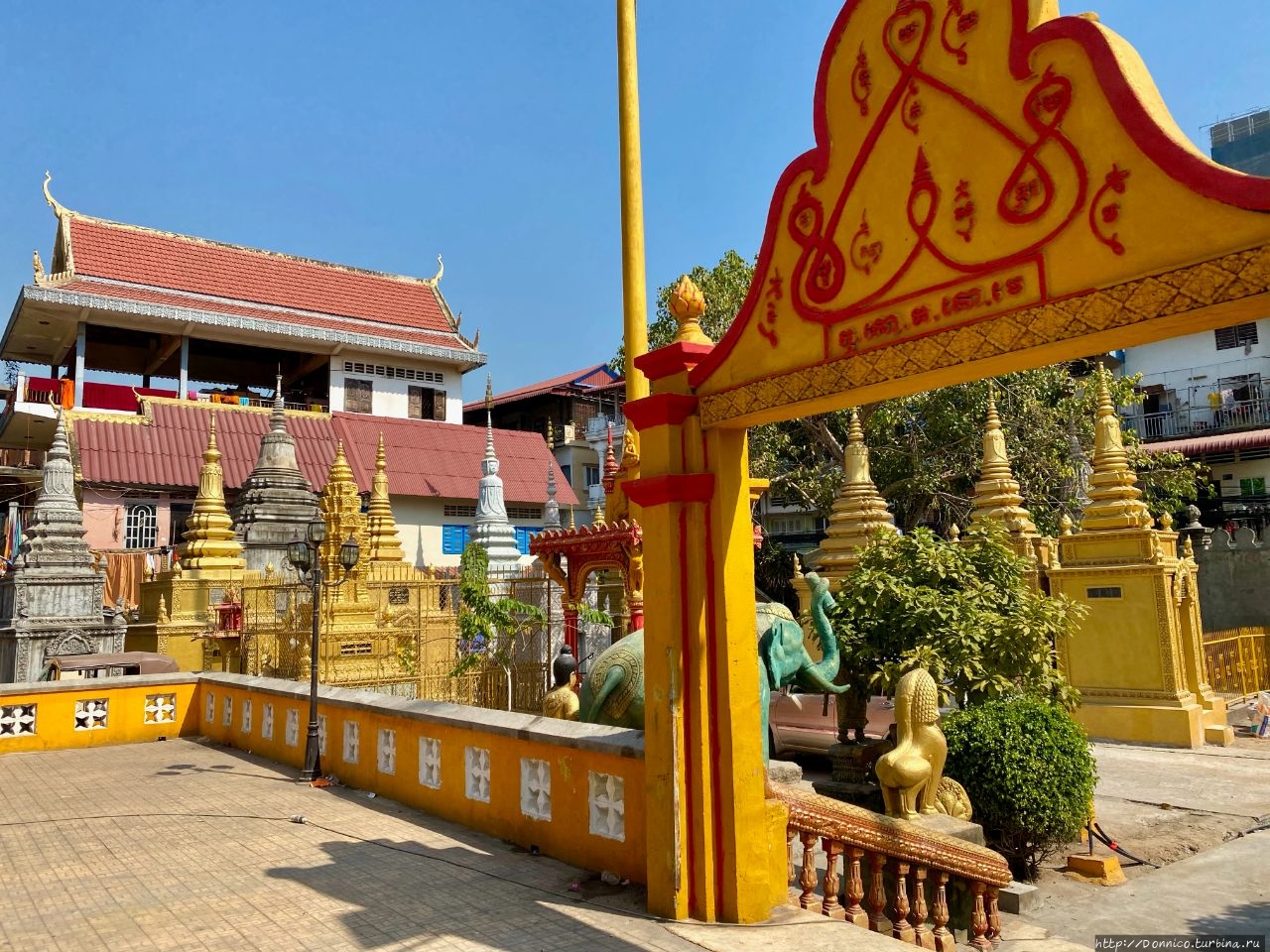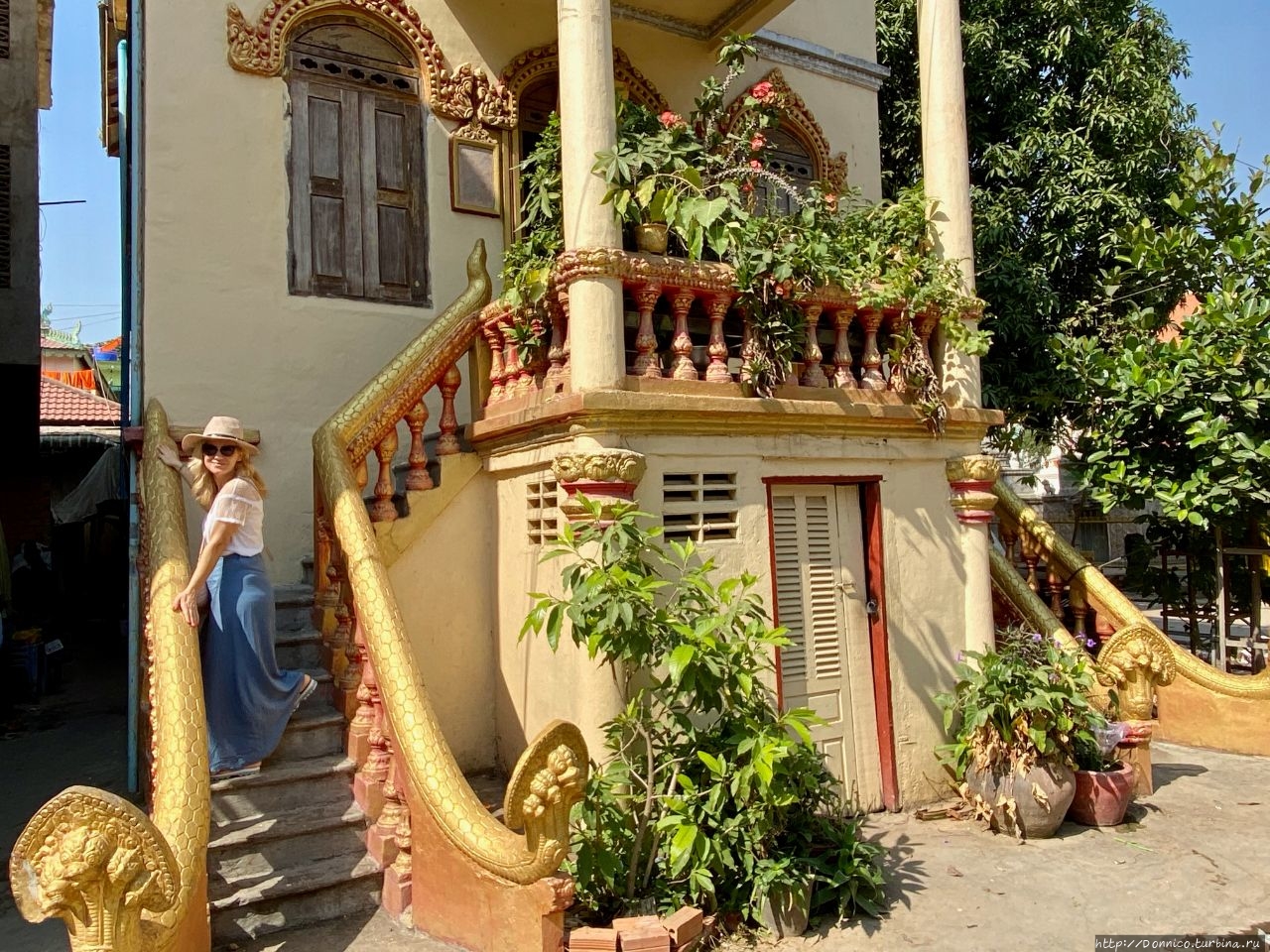 Видно, что дом старый и что он сохранился здесь от старой колониальной застройки Пномпеня. Стены монастыря его защитили. Их было сразу 2 рядом и они были, не побоюсь сказать, великолепны! Уже стоило зайти внутрь, чтобы их увидеть!